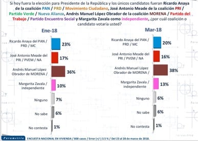 Margarita Zavala: Inició campaña, el 30 de marzo a las 00:00 horas en el Ángel de la Independencia. Estuvo acompañada por Felipe Calderón y sus dos hijos. **El INE sigue discutiendo su candidatura presidencial.