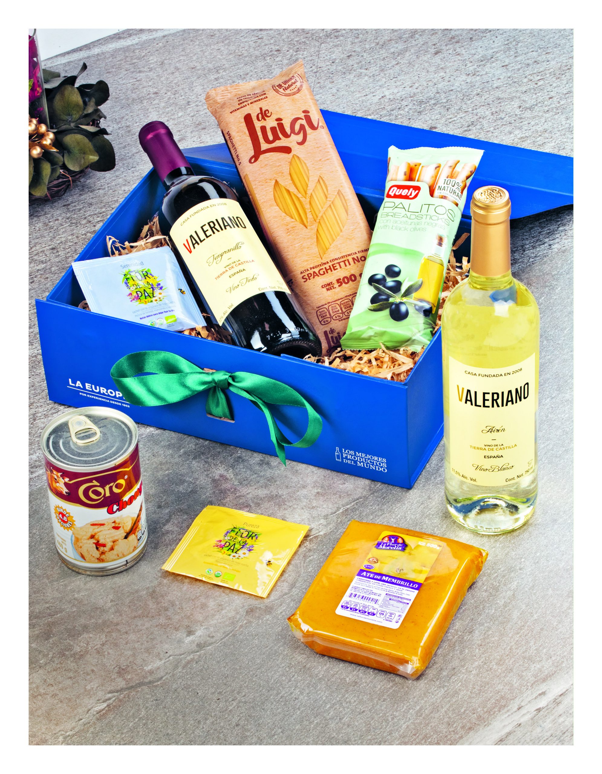 Todos tenemos esa persona que nos hace más leves los días o con quien disfrutamos casi todas las comidas entre semana, para ellos te recomendamos la Canasta #1 del Catálogo de Navidad 2020 de La Europea, que contiene 1 vino blanco Valeriano Airén, 1 vino tinto Valeriano Tempranillo, 2 sobres de té Flor de la Paz, 1 paquete de pasta, 1 ate de membrillo La Flor de Morelia, chongos zamoranos y palitos con aceitunas negras Quely. Precio: $498.00