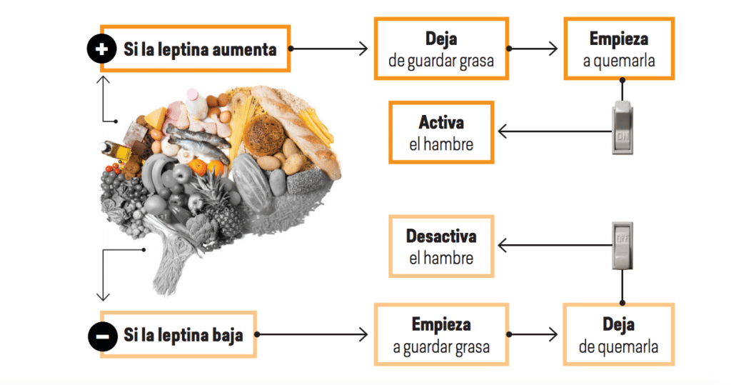 • Si la leptina en el cuerpo aumenta, le dice a tu cerebro que deje de guardar grasa, empiece a quemarla y activa al hambre