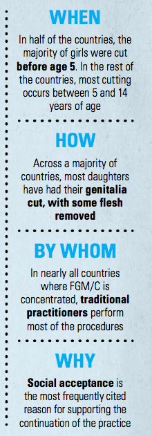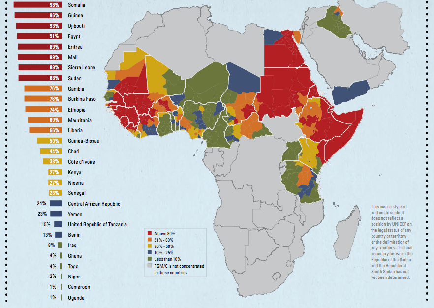 • Según la Organización Mundial de la Salud y UNICEF, más de 125 millones de mujeres y niñas de 29 países de África y Medio Oriente viven hoy con algún tipo de mutilación genital femenina.