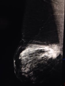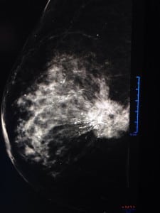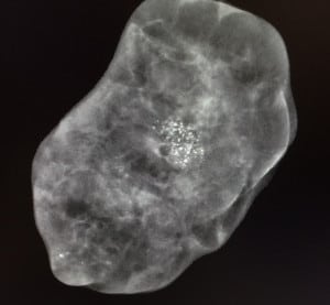 ((Mastografía digital: vemos en el tercio posterior un nódulo denso de márgenes espiculados, asociado a calcificaciones que varían en forma y densidad: relación a un cáncer ductal invasor))
