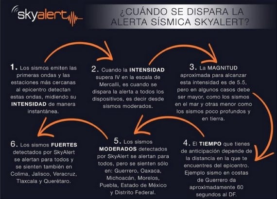 •Opera mediante una red de sensores sísmicos localizados en lugares estratégicos de la República Mexicana. Al recibir una alerta, y después de realizar en microsegundos una serie de procesos para evitar falsos positivos, se emite una señal que llega directamente a los dispositivos Skyalert alrededor de 30 a 120 segundos antes de que un sismo impacte la Ciudad de México, el área Metropolitana, Toluca o Puebla.