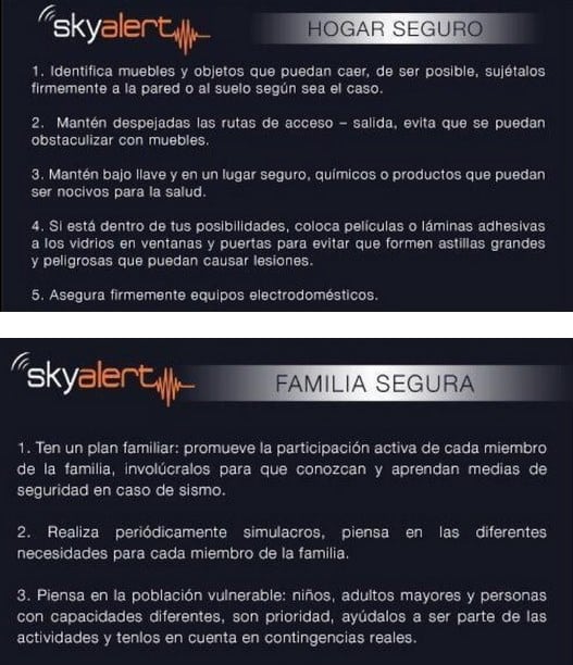 • Skyalert, es una empresa dedicada a ofrecer productos de prevención sísmica, diseñado para evitar pérdidas humanas, con un tiempo anticipado entre 30 a 120 segundos.