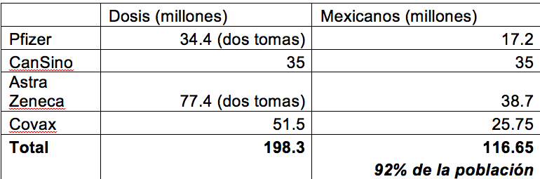 Al día de México acuerdos con tres laboratorios (Pfizer, AstraZeneca, CanSino y el COVAX Facility) que nos aseguran tener vacuna para 90% de la población, más de 160 millones de dosis para 116 millones de habitantes.